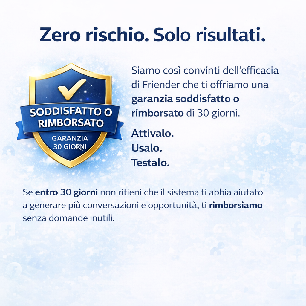 Se entro 30 giorni non ritieni che il sistema ti abbia aiutato a generare più conversazioni e opportunità, ti rimborsiamo senza domande inutili.